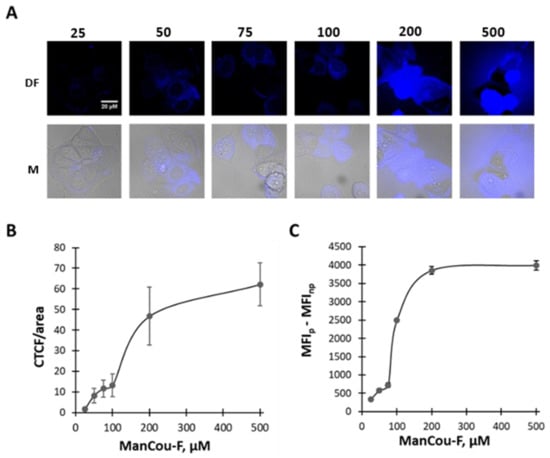Uptake analysis of different concentrations of ManCou-F (A) by confocal microscopy (B) and flow cytometry (C). (A) Representative confocal fluorescent images of concentration-dependent uptake of the probe by MCF7 cells. Images were acquired using a 60× objective and DAPI filter (exc/em: 405 nm/461 nm) at the same laser intensity and exposure time, DF—dark field, and M—fluorescence overlay images with the bright field. Each experiment was carried out in duplicate. (B) CTCF quantitated fluorescence. Quantitative fluorescence data were derived from fluorescence images of probe-treated cells using ImageJ as CTCF/area (CTCF = (IntDens (cell)) − (Int Den (bgr)) × Area (cell)). For confocal analysis, data were derived for two images per sample (~5–10 cells/image). Error bars represent the standard deviation of cell fluorescence. (C) Fluorescence obtained by Attune NxT Flow Cytometer using VL1 filter was processed as MFIprobe (median of fluorescence intensity)-MFInp (MFI of the cells with no treatment). MFI was derived excluding debris and doublets by FSC-SSC and FSC-H-FSC-W gating, respectively. For flow analysis, data were derived for 10,000 events. Each experiment was carried out in duplicate. Error bars represent the standard deviation between two experiments. The scale bar for all images is 20 µm.