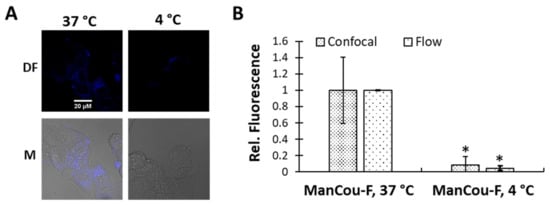 ManCou-F (25 µM) uptake in MCF7 cells preconditioned and treated at 37 °C vs. 4 °C for 15 min. Fluorescence was analyzed by confocal microscopy and flow cytometry. (A) Representative images were acquired using 60× objective and DAPI filter (exc/em: 405 nm/461 nm) at the same laser intensity and exposure time, DF—dark field, and M—fluorescence overlay images with the bright field. (B) Quantification of fluorescence derived from corresponding fluorescence images using ImageJ as CTCF/Area. A total of two images were analyzed per sample per experiment (~5–10 cells/image). Fluorescence obtained by Attune NxT Flow Cytometer using VL1 filter was processed as MFIprobe (median of fluorescence intensity)-MFInegative (MFI of the cells with no treatment). MFI was derived excluding debris and doublets by FSC-SSC and FSC-H-FSC-W gating, respectively. Each experiment was carried out in duplicate. Error bars represent the relative standard deviation derived by dividing the individual standard deviation by the average. A two-tailed t-test was used to detect statistically significant differences: * p < 0.05. Levels of probe uptake were corrected by the corresponding value obtained for 37 °C to represent relative fluorescence. The scale bar for all images is 20 µm.