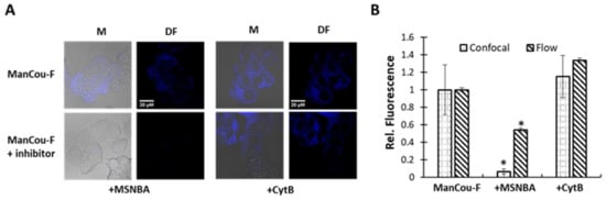 ManCou-F uptake (25 µM) in the presence of MSNBA (25 µM) and cytochalasin B (CytB, 25 μM). (A) Images were acquired using a 60× objective and DAPI filter (exc/em: 405 nm/461 nm) at the same laser intensity and exposure time, DF—dark field, and M—fluorescence overlay images with the bright field. Each experiment was carried out in duplicate. (B) Analysis of probe-induced fluorescence by confocal microscopy and flow cytometry. For microscopy analysis, data represent fluorescence derived after quantification of fluorescence images using ImageJ as CTCF/Area. Fluorescence obtained by Attune NxT Flow Cytometer using VL1 filter was processed as MFIprobe (median of fluorescence intensity)-MFInegative (MFI of the cells with no treatment). Error bars represent the relative standard deviation. A two-tailed t-test was used to detect statistically significant differences: *—p < 0.05. Relative fluorescence is derived by normalization by the control (probe without inhibitor). The scale bar for all images is 20 µm.