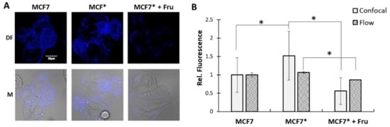 ManCou-F (50 µM) uptake changes with GLUT5 levels and fructose concentration. MCF7: cells cultured in RPMI-1640 with 10% FBS; MCF7*: MCF7 cells cultured with 11 mM fructose for 25 days. MCF7* + Fru: 11 mM fructose supplemented to the MCF7* culture directly with the probe. (A) Images were acquired using 60× objective and DAPI filter (exc/em: 405 nm/461 nm) at the same laser intensity and exposure time, DF—dark field, and M—fluorescence overlay images with the bright field. Each experiment was carried out in duplicate. (B) Data represent fluorescence derived after quantification of fluorescence images using ImageJ as CTCF/Area. Fluorescence obtained by Attune NxT Flow Cytometer using VL1 filter was processed as MFIprobe (median of fluorescence intensity)-MFInegative (MFI of the cells with no treatment). MFI was derived excluding debris and doublets by FSC-SSC and FSC-H-FSC-W gating, respectively. Error bars represent the relative standard deviation. A two-tailed t-test was used to detect statistically significant differences: * p < 0.05. Relative fluorescence is derived by normalization by the control (MCF7 cells). The scale bar for all images is 20 µm.
