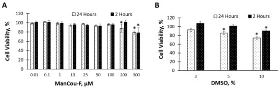 Cell viability of MCF7 cells was assessed using an MTS assay in 96-well plate format and reported as a relative colorimetric change measured at 490 nm. (A) ManCou-F cytotoxicity in MCF7 after 2 and 24 h of incubation. Each experiment was carried out in duplicate. (B) DMSO cytotoxicity in MCF7 after 2 and 24 h of incubation. A two-tailed t-test was used to detect statistically significant differences: * p < 0.05. Error bars represent the standard deviation.