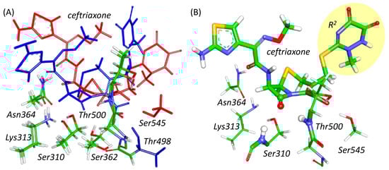 (A) Superposition of active site fragments of PBP2FA19 (blue) and PBP2H041 (red) with bound ceftriaxone. Alignment is performed over nitrogen and carbon atoms of main chains of Ser310, Lys313 and Thr500. (B) The QM part of PBP2H041 at the ES configuration; the leaving group of ceftriaxone (R2) is highlighted by a yellow ellipse. The carbonyl group of the β-lactam ring and NH fragments of Thr500 and Ser310 residues forming the oxyanion hole are represented as balls and thick sticks. Ceftriaxone and other amino acid residues are depicted with thick and thin sticks, respectively. Here and in the following figures, carbon is green, oxygen is red, nitrogen is blue, hydrogen is white, and sulfur is yellow.