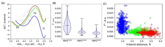 (A) Gibbs energy profiles of the first reaction step; a nucleophilic attack of PBP2 acylation by ceftriaxone. (B) Violin plots for the distributions of Fukui electrophilicity indices of the carbonyl carbon atom of the substrate, f +, in ES state. (C) Scatter plots of distances of a longer hydrogen bond in the oxyanion hole at each QM/MM MD frame versus Fukui index in the corresponding frame. Color code for panels A,C: PBP2FA19–blue, PBP235/02–green and PBP2H041–red.