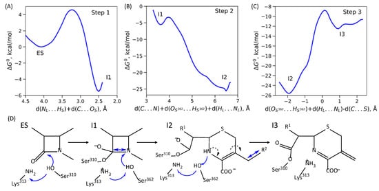 (A–C) Gibbs energy profiles of the elementary steps of acylation reaction in PBP2FA19–ceftriaxone complex; all energy values are relative to the ES. (D) Molecular mechanism of this reaction; plain blue arrows are reaction coordinates; dashed black arrows depict redistribution of electron pairs.