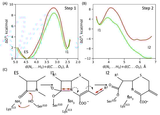 (A,B) Gibbs energy profiles of the elementary steps of ceftriaxone acylation in the active site of PBP235/02 (green) and PBP2H041 (red); all energy values are relative to the ES. (C) Molecular mechanism of this reaction; plain red arrows are reaction coordinates; dashed black arrows depict redistribution of electron pairs.