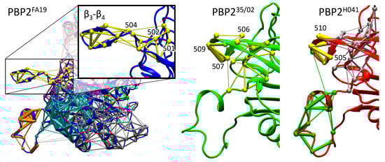 Molecular dynamic trajectories with a total length of 500 ns for each system were simulated to analyze conformational diversity introduced by amino acid substitutions. Dynamical network analysis was performed to identify communities, i.e., structural regions of the protein characterized by correlated motions. The method identified 12 communities in PBP2FA19 and PBP235/02 and 11 communities in PBP2H041. Particular attention was paid on the β3-β4 loop that is supposed to be responsible for the stabilization of the noncovalent PBP2–ceftriaxone complex upon binding []. In PBP2FA19, the entire loop containing residues 501 to 515 is assigned to a separate community and shares common edges between the base of the loop (residues 501, 502, and 504) and the rest of the protein (Figure 5). In PBP235/02, residues 502 to 512 constitute a single community, and this community has six common edges with the protein core, including a common edge with a loop tip (residue 506). This shows that the movement of the β3-β4 loop relative to the rest of the protein is limited. Moreover, at the tip of the β3-β4 loop, there is a thick edge between residues 507 and 509, which indicates that the movement in the loop is highly correlated; the tip does not open and rotate as in PBP2FA19, but exhibits flat and stretched conformation. The β3-β4 loop behavior is similar in PBP2H041 and PBP235/02. In PBP2H041, the difference from PBP2FA19 is more pronounced, as a separate community is formed except in the 505 to 510 residues, and the edges are thicker, indicating a more pronounced correlation in this region (Figure 5, PBP2H041, silver). In addition, the middle of the loop is assigned to another community, common with the protein core, and the tip of the loop has a common edge with the loop located under β3-β4 (Figure 5, PBP2H041, green). Thus, dynamical network analysis reveals that the β3-β4 loop moves independently from the rest of the protein and demonstrates more twisted conformations in the in PBP2FA19 in contrast to that from PBP2 from the mutant strains. Combining these data with experimental studies reposted in Ref [], we can conclude that PBP2FA19 should have higher affinity to ceftriaxone.