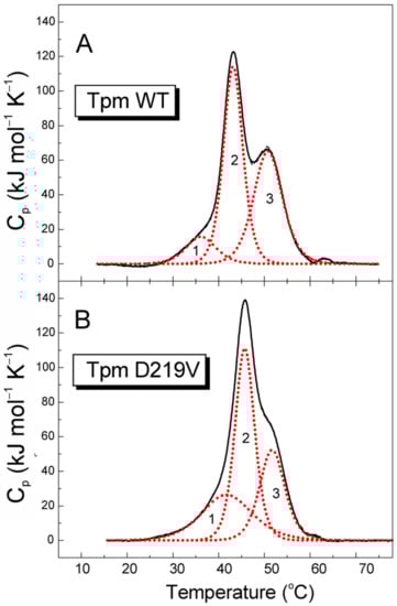 Temperature dependences of the excess heat capacity (Cp) monitored by DSC and deconvolution analysis of the heat sorption curves for WT Tpm (A) and Tpm with mutation D219V (B). Solid lines represent the experimental curves after the subtraction of instrumental and chemical baselines, and dotted red lines represent the individual thermal transitions (calorimetric domains) obtained from fitting the non-two-state model [25] to the data.