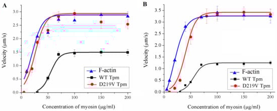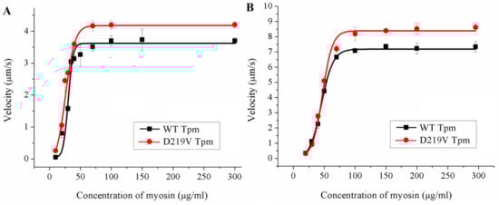 To characterize the effect of the D219V mutation on the actin-myosin interaction, we analyzed, using an in vitro motility assay, the dependence of the sliding velocity of the F-actin–Tpm filament on the surface density of myosin, which was varied by changing the myosin concentration in the flow cell (Figure 4, Table 2). Earlier, it was shown that the myosin concentration needed for bare F-actin to achieve the half-maximal velocity is significantly lower than that for the F-actin–Tpm filaments [29,30]. Here, the addition of WT Tpm decreased the F-actin velocity significantly, whereas the D219V Tpm did not affect the velocity. In addition, the F-actin–Tpm filaments with the D219V mutation required substantially less myosin concentration to achieve the half-maximal velocity than those with WT Tpm. Thus, the D219V Tpm mutation significantly affects the tropomyosin regulation of actin-myosin interaction.