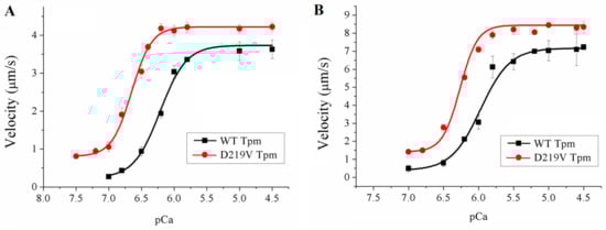 The changes in the parameters of Ca2+-dependent movements of thin filaments over ventricular and atrial myosin caused by the D219V Tpm mutation were similar. The main features were as follows (Figure 5, Table 3): (i) incomplete inhibiting of filament sliding at low Ca2+ concentrations (pCa ≥ 7); (ii) increased Ca2+ sensitivity characterized by Ca2+ concentration required for half-activation of the sliding velocity; and (iii) increased sliding velocity at saturating Ca2+ concentrations for both ventricular and atrial myosin. The first two features, increased Ca2+ sensitivity and incomplete relaxation at low Ca2+ concentrations, are characteristic of HCM [6,7,14,15].