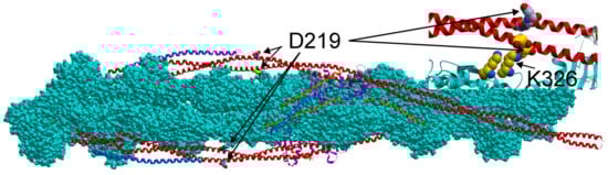 Effects similar to those reported here were found for the E218L substitution of the neighboring Tpm residue [40]. An increase in the Ca2+ sensitivity of the sliding velocity of the thin filaments in vitro with E218L Tpm, as well as an increase in maximum sliding velocity and residual Ca2+-free filament motility compared to WT Tpm. Again, no changes in the Tpm affinity for actin and only a slight increase in the thermal stability of the Tpm-actin complex were found. The similarity in the functional properties of D219V and E218L Tpm is not surprising, as both residues are probably involved in electrostatic and h-bonding interactions with K326 and K328 residues of actin (Figure 7 and Figure 8). In addition, the E218L substitution significantly increased the bending stiffness of Tpm estimated by MD simulation and the thermal stability of Tpm as the polar destabilizing non-canonical Tpm core residue E218 was substituted by a canonical hydrophobic one.