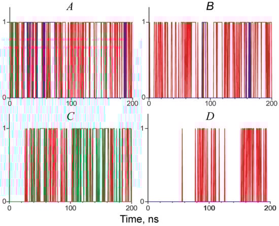 The time course of the existence of h-bonds between E218 and D (or V)219 Tpm residues and K326 and K328 residues of neighboring actin monomers during a 200 ns-long MD trajectory with WT Tpm (A,C) and D219V Tpm (B,D); vertical axis: one means at least one h-bond between the residues, zero otherwise; (A–D) correspond to two different Tpm strands. The h-bond between E218 of Tpm and K326 of actin is red; the h-bond between E218 of Tpm and K328 of actin is blue; and the h-bond between D (or V)219 Tpm residue and K326 of actin is green.