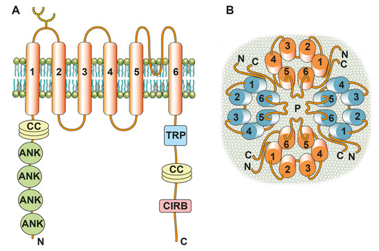 A schematic drawing of the transient receptor potential canonical (TRPC) structure. Six transmembrane segments (numbered 1 to 6) contribute to the formation of a monomer. Both the COOH (C) and NH2 (N) terminus feature different domains enabling further channel interactions. These include coiled-coil domains (CC), ankyrin domains (ANK), a TRP box (TRP), a calmodulin, and IP3-R binding site (CIRB). Different outer potential glycosylation sites exist and differ among the different TRPC entities [19] ((A); inspired from [20]). Four monomers, from the same or different TRPC entities, assemble to form a homo- or heterotetramer. The loops between the transmembrane segments 5 and 6 contribute to the formation of the cation-permeable pore (P) ((B); view from above).