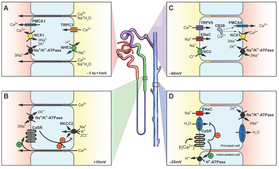 A schematic drawing of the renal tubular system. The glomerulus (brown) produces a primary urine that flows into the proximal convoluted tubule (red). Then, it reaches the proximal straight tubule before ending up in the loop of Henle, which is composed of a thin (dark blue) and a thick (green) part. The latter drains the urine into the distal convoluted tubule (purple) before reaching the collecting duct (light blue) via the connecting tubule, which is not specifically displayed here [24]. The magnifications detailed in (A–D) reveal physiological mechanisms of the tubular Ca2+ reabsorption. Approximatively 98% of the filtered Ca2+ is reabsorbed. About 65% are reabsorbed in the proximal tubule, 25% in the thick ascending limb, and 8% in the distal and connecting tubule. The collecting duct plays a negligible role in this context. Most of the Ca2+ reabsorption in the proximal tubule is of paracellular nature and partly driven by the transcellular Na+ reabsorption mediated by the apical sodium/proton exchanger 3 (NHE3) and the basolateral Na+/K+-ATPase. Transcellular pathways and the roles of TRPC3, the plasma membrane calcium ATPase 1 (PMCA1), and the Na+/Ca2+-exchanger 1 (NCX1) are discussed below (A). The thick ascending limb features a regulated paracellular Ca2+ reabsorption which is driven by the Na+ reabsorption which is mediated by the Na+/K+/2Cl— cotransporter (NKCC2) and the Na+/K+-ATPase. In terms of a negative feedback-loop, reabsorbed Ca2+ can activate basolateral calcium sensing receptors (CaSR) which in turn decrease the Na+ reabsorption and the paracellular claudin-mediated Ca2+ reabsorption (B). In the distal and connecting tubules, however, Ca2+ reabsorption is of a transcellular nature. Sodium enters the cell through the epithelial Na+ channel (ENaC) or the Na+/Cl— cotransporter (NCC) and leaves it on the basolateral side using the Na+/K+-ATPase. The latter drives the Na+/Ca2+-exchanger 1 (NCX1) which shares the function of basal Ca2+ discharging with the plasma membrane calcium ATPase 4 (PMCA4). Apical Ca2+ entrance occurs using the vanilloid transient receptor potential 5 channel (TRPV5). Transcellular transport is mediated by calbindin D-28k (CB28) (C). Luminal Ca2+ concentration is sensed by calcium sensing receptors (CaSR) in the collecting duct. Their activation leads to the inhibition of aquaporin-2 (AQP-2)-mediated H2O reabsorption in the principal cells and activation of the H+-ATPase in the intercalated cells with subsequent urine acidification ultimately reducing the probability of crystal precipitation. Basolateral H2O transport occurs through aquaporins-3 and -4 (AQP-3/4) (D). Inspired by [25].