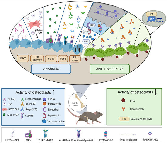 Treatments evaluated in OI preclinical studies to improve bone parameters of murine models. Anabolic therapies are illustrated in blue (targeting Wnt pathway, PGE2, TGFB superfamily, ER stress, or stem-cell therapy), while anti-resorptive ones are in green.