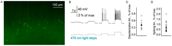 n = 10). A 470 nm light pulse with a minimal intensity of 0.33 ± 0.02% of the maximum (