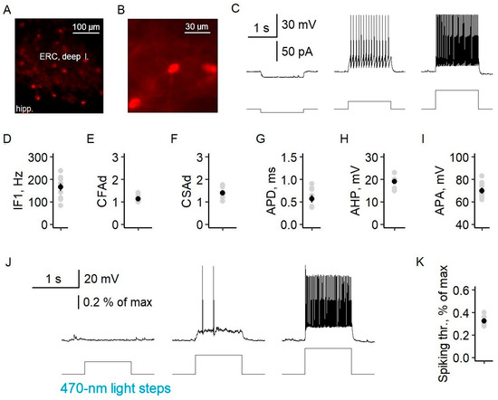AAV-EF1α-double-floxed-hChR2(H134R)-mCherry was prepared at the Institute of Bioorganic Chemistry RAS (Moscow, Russia) from plasmid pAAV-EF1a-double-floxed-hChR2(H134R)-mCherry-WPRE-HGHpA (#20297, Addgene) with a titer of 2.4 × 1012 GC/mL. PV-Cre mice were anesthetized with a cocktail of zoletil-100 (40 mg/kg) and xylazine (10 mg/kg) and positioned in a stereotaxic frame (SM-15 Narishige, Tokyo, Japan). AAV-EF1α-double-floxed-hChR2(H134R)-mCherry vector was delivered to the entorhinal cortex (1 µL at a rate of 0.05 µL/min). Injection coordinates were as follows: anteroposterior: –4.0; mediolateral: 3.5; and dorsoventral: 4.2 mm. Hamilton syringes were inserted at a 3–5° anteroposterior angle. After completion of the surgery, mice were placed on a heat pad for 24 h to allow recovery and then returned to their home cages. The seams were treated with laevomecolum for a week.