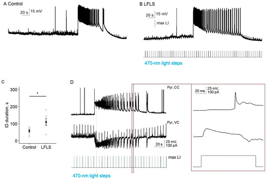 18]. Monitoring of the ictal activity was implemented with extracellular recordings. The 1 Hz photostimulation during 180 s of either CaMKII-, SOM-, or PV-positive neurons suppressed ictal activity. The effects of longer durations of LFLS were not reported in that work.