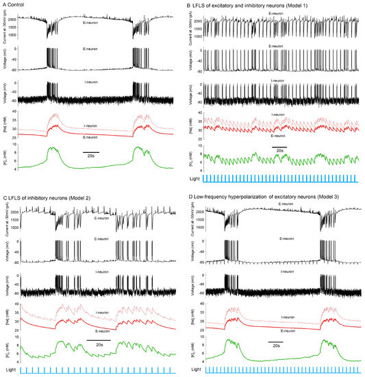 37] and supplemented it with a module reflecting LFLS action. The proposed model belongs to the class of biophysically detailed models in which the excitation of the neuronal network is described in the form of equations for the conductance of voltage-dependent and ligand-dependent ion channels, where the excitation–inhibition balance changes over time according to the dynamics of ion concentration. Our model is one of the few models of this class that can reproduce spontaneously repeated ictal and interictal discharges. For example, Krishnan et al. [