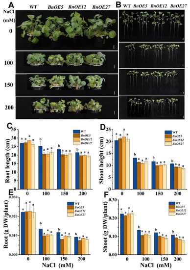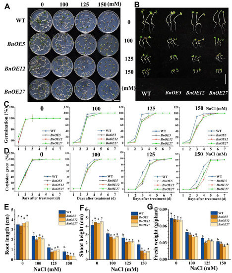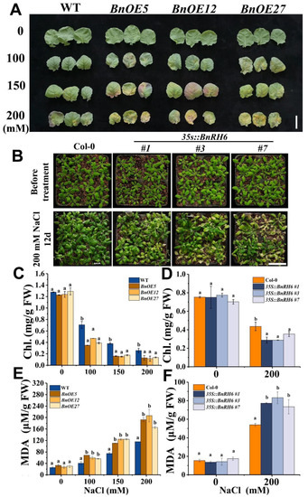 2.3. BnRH6 Overexpressed Brassica and Arabidopsis Display Salt Sensitivity