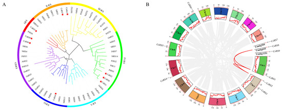The phylogenetic tree, distribution and duplication events of CsRs. (A) Phylogenetic tree of RS proteins constructed using the neighbor-joining(NJ) phylogenetic tree by MEGA X. In total, 57 RS protein sequences from different species were used to construct the phylogenetic tree by MEGA X. The seven different groups are indicated by different colors. Am: Alonsoa meridionalis, Cm: Cucumis melo, Cs: Camellia sinensis, Os: Oryza sativa, Ps: Pisum sativum, Pt: Populus trichocarpa, Rc: Ricinus communis, Si: Sesamum indicum, Va: Vigna angularis, Vv: Vitis vinifera, Zm: Zea mays. The red star represents the RSs in Camellis sinensis. (B) Chromosomal localization and gene duplication events in CsRSs. From outside to inside, the first circle is the chromosome number with the scale on top indicating the coordinate position of the chromosome, and the second circle is the chromosome number and density. Red line indicates gene duplication.