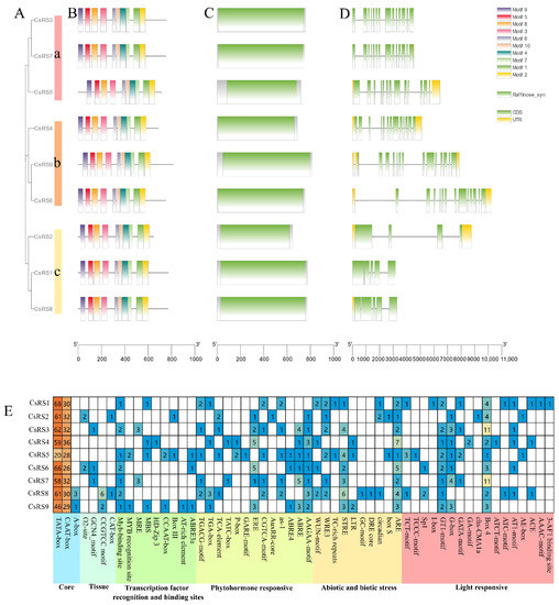 To classify the nine CsRSs, a phylogenetic tree was constructed using MEGA X [38] based on the sequences. The nine CsRSs were divided into three classes: CsRS3/CsRS5/CsRS7, CsRS4/CsRS6/CsRS9, and CsRS1/CsRS2/CsRS8 (Figure 2A). The prediction results of the conservative motif showed that all CsRS contained 10 motifs, ranging from 6 to 50 amino acids (Figure 2B). All the identified CsRSs contain RS protein domain (Figure 2C). The number of exons per gene ranged from 4 to 14 (Figure 2D), and the genes in the same cluster showed highly similar exon numbers: 3 members (CsRS3, CsRS5 and CsRS7) in Cluster a contained 12 to 14 exons, 3 members in Cluster b (CsRS4, CsRS6 and CsRS9) contained 13 to 14 exons, and 3 members (CsRS1, CsRS2 and CsRS8) in Cluster c contained 4 to 5 exons. Significantly, CsRS1 and CsRS3 had no introns.