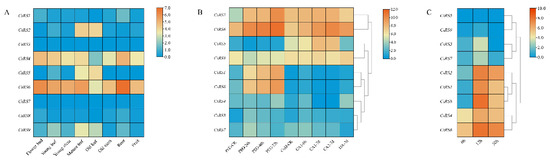 The heat map of CsRSs expression mode. (A) Expression pattern of CsRSs in different parts of the tea plant. (B) Expression pattern of CsRSs during continuous drought stress and cold acclimation. The FPKM of the continuous drought stress and cold acclimation converted by log2. PEG-CK: untreated, PEG-24: PEG treatment for 24 h, PEG-48: PEG treatment for 48 h, PEG-72: PEG treatment for 72 h, Cold-CK: nonacclimated at 25~20 °C, CA1-6 h: fully acclimated at 10 °C for 6 h, CA1-7 d: fully acclimated at 10~4 °C for 7 days, DA-7 d: recovering under 25~20 °C for 7 days. (C) Expression pattern of CsRSs in the withering process of white tea.