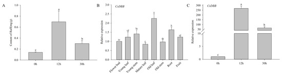 Raffinose content and CsDBB expression pattern. (A) Changes of Raf content in white tea during withering. (B) Expression pattern of CsDBB in different parts of the tea plant. (C) Expression pattern of CsDBB in the withering process of white tea. Different letters represent significant differences (p < 0.05).