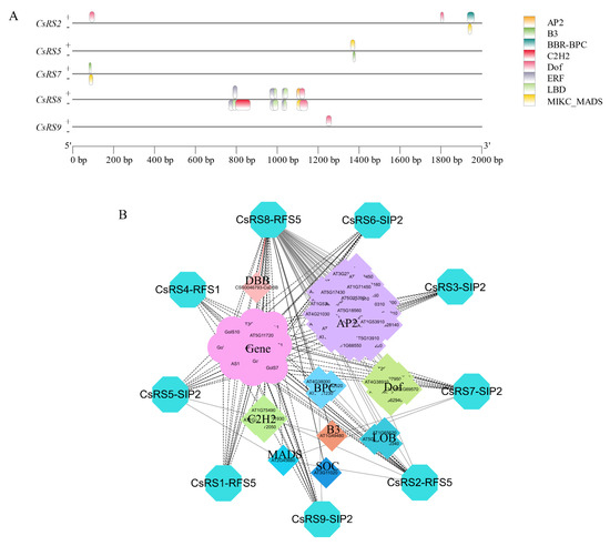 We obtained the protein interaction regulatory network of CsRSs through the yeast one-hybrid, STRING and PlantTFDB databases. Nine CsRSs were compared to three AtRSs in Arabidopsis; CsRS4 corresponded to AtRFS1, CsRS1 and CsRS2; CsRS8 corresponded to AtRFS5, CsRS3 and CsRS5, CsRS6, and CsRS7; CsRS9 corresponded to AtSIP2; a total of 14 functional genes were predicted to interact with CsRSs; 64 transcription factors were found to possibly regulate the expression of CsRSs (Figure 5B). There are 11 galactosidases and 1 stachyose synthase in 14 functional proteins, and 64 transcription factors mainly belonging to the AP2, Dof, C2H2, LOB and other transcription factor families.
