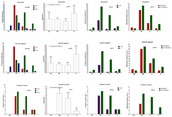 Relationships between CNA, gene expression, sites of loss of heterozygosity, and methylation of the promoter region of the BRCA1 gene with the effectiveness of NAC in a general group of patients (A), those treated with anthracycline-containing regimen (AC/CAX) (B), and those treated with taxotere monotherapy (C). Note: abscissas show the effect of neoadjuvant chemotherapy. CR: complete regression; PR: partial regression; ST: stabilization; P: progression. A nonparametric Kruskal–Wallis test was used to assess the differences among independent samples in terms of expression level. Frequency comparisons are based on two-tailed Fisher’s test or chi-squared test.