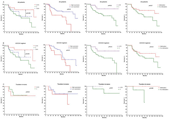 Relationships between CNA, gene expression, sites of loss of heterozygosity, and methylation of the promoter region of the BRCA1 gene with metastatic-free survival in the general group of patients (A), patients treated with anthracycline-containing regimen (AC/CAX) (B), and patients treated with taxotere monotherapy (C). Note: a log rank test was used to compare significance of differences among groups in terms of survival.