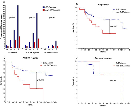 Relationship between BRCAness phenotype with effectiveness of NAC (A) and metastatic survival in the general group of patients (B), patients treated with anthracycline-containing regimen (AC/CAX) (C), and patients treated with taxotere monotherapy (D). CR: complete regression; PR: partial regression; ST: stabilization; P: progression. Wilcoxon–Mann–Whitney test was used to test significance of differences among the study groups. Frequency comparisons were based on two-tailed Fisher’s test or chi-squared test.