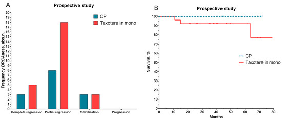 We conducted a prospective study on the significance of BRCA1 status for personalized NAC regimens based on our data and the literature. The prospective group included 40 patients (Table 1). If the patients had low expressions or deletions of the BRCA1 gene (presence of a deficiency in homologous recombination), they received NAC regimens with platinum-based preparations (cyclophosphamide at 600 mg/m2 on the first day and cisplatin at 100 mg/m2 on the first day (CP)). The rest of the patient group received taxotere (100 mg/m2 hourly infusion per day). For the group of patients treated with CP, 78.6% had an objective response to the treatment, including complete and partial tumor regression (11/14 patients). A similar result was shown for patients in the second group (taxotere) for complete and partial regression (88.5%, 23 out of 26 patients) (Figure 4).