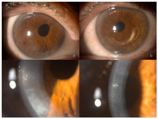 - Lam, H.; Wiggs, J.; Jurkunas, U. Unusual presentation of presumed posterior polymorphous dystrophy associated with iris heterochromia, band keratopathy, and keratoconus. Cornea 2010, 29, 1180. Available online: https://www.ncbi.nlm.nih.gov/pmc/articles/PMC2945457/ (accessed on 10 March 2022). [CrossRef] [PubMed]