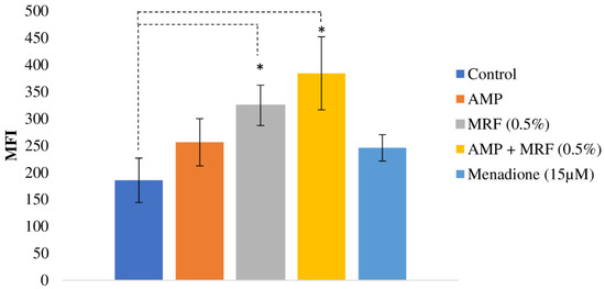 The effect of MRF on ROS production in antibiotic-resistant E. coli with and without antibiotic treatment. Diagram displays mean fluorescent intensity (MFI/OD595nm) of antibiotic-resistant E. coli. Antibiotic-resistant E. coli treated with 5 mgmL−1 ampicillin (AMP). Standard deviation is represented by error bars (n = 6). Means that were significantly different to the control are marked with an asterisk (*) (p ≤ 0.01, ANOVA, Fisher-LSD).
