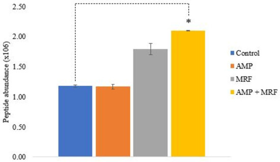 Normalized peptide abundance of E. coli regulatory protein ARCA. Control culture treated with AMP (0.1 mgmL−1 AMP), MRF (1 mgmL−1), or a combination of AMP (0.1 mgmL−1) + MRF (1 mgmL−1). Standard error is represented by error bars. Means that were significantly different to control are marked with an asterisk (*); p ≤ 0.03, ANOVA, T-test, two-sample assuming unequal variances.