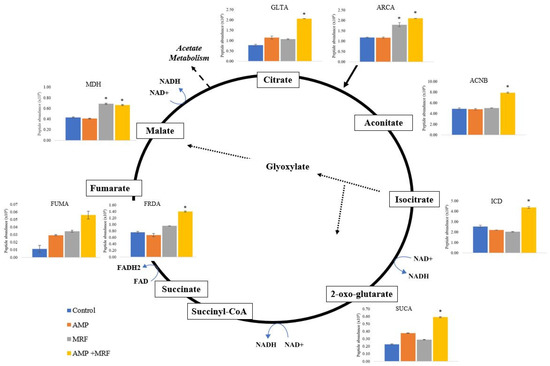 The influence of MRF on the translation of key intermediates of the citric acid cycle. The figure illustrates a comparison of normalized peptide abundance of control, AMP (0.1 mgmL−1 AMP), MRF (1 mgmL−1), and a combination of AMP (0.1 mgmL−1) + MRF (1 mgmL−1) cultures. Standard error is represented by error bars. Means that were significantly different to control are marked with an asterisk (*); p ≤ 0.05, ANOVA. Abbreviations: GLTA, citrate synthase; ARCA, aerobic respiration control protein; ACNB, aconitate hydratase; ICD, isocitrate dehydrogenase (NADP); SUCA, 2-oxoglutarate dehydrogenase E1 component; FUMA, fumarate hydratase class I; FRDA, fumarate reductase flavoprotein subunit; MDH, malate dehydrogenase.