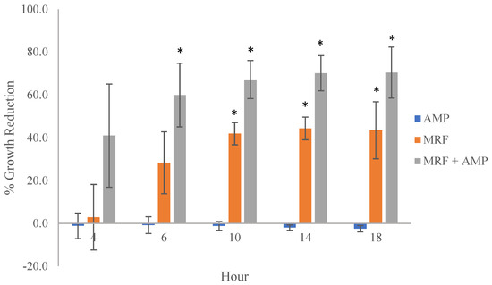 The effect of MRF and antibiotic treatment on the growth of antibiotic-resistant E. coli (n = 3) relevant to control culture. AMP (0.5 µgmL−1 AMP), MRF (5 mgmL−1), or a combination of AMP (0.5 mgmL−1) + MRF (5 mgmL−1) cultures. Standard error is represented by error bars. Means that were significantly different to one another within each time point are marked with an asterisk (*), p ≤ 0.05, ANOVA.