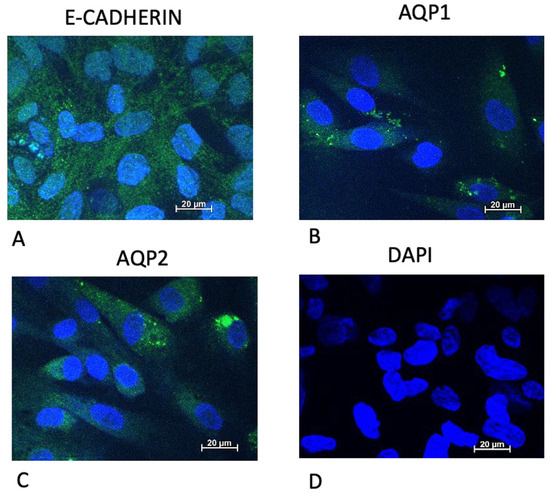 We used a mouse anti-E-cadherin (610182 BD Biosciences, Milan, Italy), the polyclonal antibodies AQP1, Alexa Fluor®647 conjugated (BS-1506R-A647 CliniSciences, Nanterre France), and AQP2, Cy5 conjugated (BS-4611R-CY5 CliniSciences) to investigate cell origin.