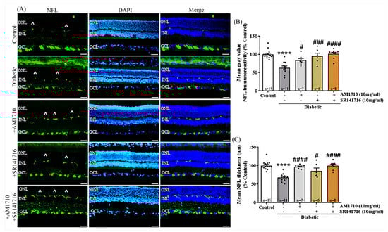 Effect of cannabinoid treatment on ganglion cell axons in the diabetic retina. (A) Representative photomicrographs of NFL immunoreactivity (NFL-IR). Artifacts are depicted by the marker (^). Magnification: 20×. Scalebar: 50 μm. (B) Quantification studies of NFL-IR: Diabetes attenuated NFL-IR (**** p < 0.0001 compared to Control). Both AM1710 and SR141716 reversed the diabetes effect (AM1710; # p = 0.0403 compared to diabetic untreated, p > 0.05 compared to Control, and SR141716; ### p = 0.0008 compared to diabetic untreated, p > 0.05 compared to Control). The dual treatment with AM1710 + SR141716 displayed a similar action by restoring NFL-IR (#### p < 0.0001 compared to diabetic untreated, p > 0.05 compared to Control, p > 0.05 compared to AM1710 or SR141716. (C) Diabetes induced a significant decrease in NFL thickness (**** p < 0.0001 compared to Control). AM1710 and SR141716 reversed the diabetes effect (AM1710; #### p < 0.0001 compared to diabetic untreated, p > 0.05 compared to Control, and SR141716; # p = 0.0183 compared to diabetic untreated, p > 0.05 compared to Control). Dual treatment with AM1710 + SR141716 blocked the diabetes-induced reduction in NFL thickness (#### p < 0.0001 compared to diabetic untreated, p > 0.05 compared to Control p > 0.05 compared to AM1710 or SR141716). Data are expressed as mean ± S.D and presented in a form that combines a bar diagram and scatter dot plot, with every dot representing a different value. One-way ANOVA was employed for the statistical analysis of all data, followed by Tukey’s multiple comparison test. Differences were considered statistically significant when p < 0.05.