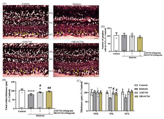 Effect of cannabinoid treatment in the thickness of retinal tissue. (A) Representative photomicrographs of H & E stained retinal tissue). Ganglion cells (black) are depicted with yellow arrows. Magnification 20×. Scalebar: 50 μm. (B) Quantification analysis of the whole retinal tissue thickness, measured from the retinal pigment epithelium (RPE) to the ganglion cell layer (GCL). Diabetes induced a significant reduction in the total thickness of the retina (**** p < 0.0001 compared to Control). Administration of AM1710 partially blocked the reduction in the thickness of the diabetic retina (* p = 0.0161 compared to Control, # p = 0.0271 compared to diabetic untreated). SR141716 displayed similar actions (p > 0.05 compared to Control, ## p = 0.0019 compared to diabetic untreated). (C) Quantitative analysis of the thickness of three separate nuclear retinal layers, outer nuclear layer (ONL), inner nuclear layer (INL), and GCL. Diabetes had no effect on the thickness of ONL (p > 0.05 compared to Control). INL: The thickness of INL in the diabetic retinas was significantly thinner compared to the retina of Control animals ** p = 0.0034 compared to Control). Treatment with either the CB2R agonist (AM1710; # p = 0.0244 compared to Diabetic untreated, p > 0.05 compared to Control) or CB1R antagonist (SR141716; # p = 0.0383 compared to diabetic untreated, p > 0.05 compared to Control), reversed this reduction of thickness. GCL: The thickness of GCL remained unaffected by diabetes (p > 0.05 compared to Control). (D) Quantitative analysis of the ganglion cell population in GCL. The number of ganglion cells in GCL remains unaltered by diabetes (p > 0.05 compared to Control). Data are expressed as mean ± S.D and presented in a form that combines a bar diagram and scatter dot plot, with every dot representing a different value. One-way ANOVA was employed for the statistical analysis of data on panels (B,D), followed by Tukey’s multiple comparison test. Two-way ANOVA was employed for the analysis of separate layers’ thickness on panel (C), followed by Sidak’s multiple comparison test. Differences were considered statistically significant when p < 0.05.