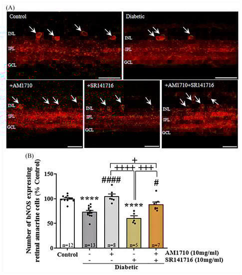 Effect of cannabinoid treatment on the nitric oxide synthetase (bNOS) expressing retinal amacrine cell viability in the diabetic retina. (A) Representative photomicrographs of bNOS immunoreactivity (bNOS-IR). White arrows indicate bNOS expressing retinal amacrine cells. Magnification: 40×. Scale bar: 50 μm. (B) Quantification of bNOS-IR: Diabetes attenuated in a statistically significant manner the number of bNOS expressing retinal amacrine cells, compared to Control animals (**** p < 0.0001 compared to Control). AM1710 reversed the diabetes effect (#### p < 0.0001 compared to diabetic untreated, p > 0.05 compared to Control). SR141716 had no effect (p > 0.05 compared to diabetic untreated, **** p < 0.0001 compared to Control, ++++ p < 0.0001 compared to AM1710). The dual treatment, AM1710+ SR141716, blocked diabetes-induced loss of bNOS+ cells (# p = 0.0192 compared to diabetic untreated, + p = 0.0388 compared to AM1710, +++ p = 0.0003 compared to SR141716). Data are expressed as mean ± S.D and presented in a form that combines a bar diagram and scatter dot plot, with every dot representing a different value. One-way ANOVA was employed for the statistical analysis of all data, followed by Tukey’s multiple comparison test. Differences were considered statistically significant when p < 0.05.