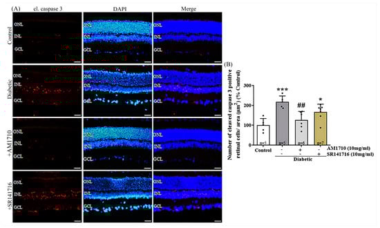 Effect of cannabinoid treatment on cl. caspase-3 dependent apoptosis in the diabetic retina. (A) Representative photomicrographs of cleaved caspase-3 immunoreactivity (cl. caspase 3-IR). Magnification: 20×. Scalebar: 50 μm. (B) Quantification studies of cl. caspase 3-IR: Diabetes induced an increase in apoptotic caspase 3+ cells in the INL of diabetic rats (*** p = 0.0004 compared to Control). AM1710 reversed the diabetes effect (## p = 0.0038 compared to diabetic untreated, p > 0.05 compared to Control). SR141716 (had no effect (p > 0.05 compared to diabetic untreated, * p = 0.0308 compared to Control, p > 0.05 compared to AM1710). Data are expressed as mean ± S.D and presented in a form that combines a bar diagram and scatter dot plot, with every dot representing a different value. One-way ANOVA was employed for the statistical analysis of all data, followed by Tukey’s multiple comparison test. Differences were considered statistically significant when p < 0.05.
