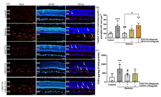 Effect of cannabinoid treatment on macrophage (microglia) activation and pro-inflammatory cytokine (TNFα) release in the diabetic retina. (A) Representative photomicrographs of Iba1 immunoreactivity (Iba1-IR). White arrows indicate reactive microglial cells. Magnification: 20×. Scalebar: 50 μm. (B) Quantification studies of Iba1-IR: Diabetes increased in a statistically significant manner the number of reactive Iba1+ cells (*** p = 0.0004 compared to Control). AM1710 reduced Iba1+ activation (## p = 0.0010 compared to diabetic untreated, p > 0.05 compared to Control), while SR141716 had no statistically significant effect (p > 0.05 compared to diabetic untreated, p > 0.05 compared to Control, p > 0.05 compared to AM1710). Dual treatment with AM1710 + SR141716 had no effect on the number of reactive Iba1+ cells (p > 0.05 compared to diabetic untreated, ** p = 0.0047 compared to Control, + p = 0.0106 compared to AM1710, p > 0.05 compared to SR141716). (C) Quantitative analysis of TNFα levels Diabetes-induced upregulation in TNFα levels in the diabetic retinas (** p = 0.0055 compared to Control). AM1710 attenuated this diabetes effect (# p = 0.0290 compared to diabetic untreated, p > 0.05 compared to Control). No statistically significant effect on TNFα levels was observed by the SR141716 (p > 0.05 compared to diabetic untreated, p > 0.05 compared to Control). Data are expressed as mean ± S.D and presented in a form that combines a bar diagram and scatter dot plot, with every dot representing a different value. One-way ANOVA was employed for the statistical analysis of all data, followed by Tukey’s multiple comparison test. Differences were considered statistically significant when p < 0.05.