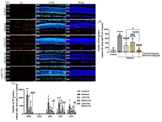 Quantitative analysis of the different retinal layers revealed that diabetes induced an increase in NT+ cells in RPE [1135.64 ± 245.12, ** p < 0.0010 compared to Control (10 ± 24.49)], outer plexiform layer (OPL) [690.92 ± 234.68, *p < 0.0161 compared to Control (100 ± 113.94)], INL [653.02 ± 173.59, *** p < 0.0006 compared to Control (100 ± 126.07)], GCL [485.42 ± 141.33, * p < 0.0258 compared to Control (100 ± 109.54)], but not in ONL (p > 0.05 compared to Control) (Figure 7C). AM1710 induced a statistically significant reduction in the number of NT+ cells in the previously mentioned layers (RPE: 0.85 ± 0.78, # p < 0.0177; OPL: 196.70 ± 81.43, # p < 0.0498; INL: 135.97 ± 56.89, # p < 0.0237; GCL: 150.79 ± 42.26, # p < 0.0451 compared to diabetic untreated) (Figure 7C). SR141716 reduced in a statistically significant manner only the number of NT+ cells in the GCL (RPE: 416.46 ± 353.76, p > 0.05; OPL: 204.94 ± 153.05, p > 0.05; INL: 351.74 ± 122.43, p > 0.05; GCL: 248.87 ± 112.53, # p < 0.0187 compared to Control) (Figure 7C). INL SR141716 also displayed a statistically significant difference with AM1710 (+ p < 0.0297 compared to AM1710) (Figure 7C). AM1710 + SR141716 also reduced nitrative stress in retinal layers (RPE: 60.70 ± 93.19, ### p < 0.0002; OPL: 58.30 ± 106.24, ## p < 0.0013; INL: 103.72 ± 106.57, ## p < 0.0033; GCL: 76.06 ± 81.55, ## p < 0.0037 compared to diabetic untreated) (Figure 7C).