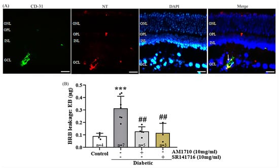 Effect of cannabinoid treatment on diabetes-induced blood–retinal barrier leakage. (A) Co-localization of CD-31, NT, and the nuclear marker DAPI. Representative photomicrograph of a diabetic untreated retina, showing that NT is colocalized with CD-31 in blood vessels in the GCL. White arrow marks the co-localization area. Magnification: 20×. Scalebar: 50 μm. (B) Quantitative analysis of EB data: Diabetes induced an increase in BRB leakage (*** p = 0.0007 compared to Control). Treatment with either AM1710 (## p = 0.0021 compared to diabetic untreated, p > 0.05 compared to Control) or SR141716 (## p = 0.0048 compared to diabetic untreated, p > 0.05 compared to Control) blocked this effect. Data are expressed as mean ± S.D and presented in a form that combines a bar diagram and scatter dot plot, with every dot representing a different value. One-way ANOVA was employed for the statistical analysis of all data, followed by Tukey’s multiple comparison test. Differences were considered statistically significant when p < 0.05.