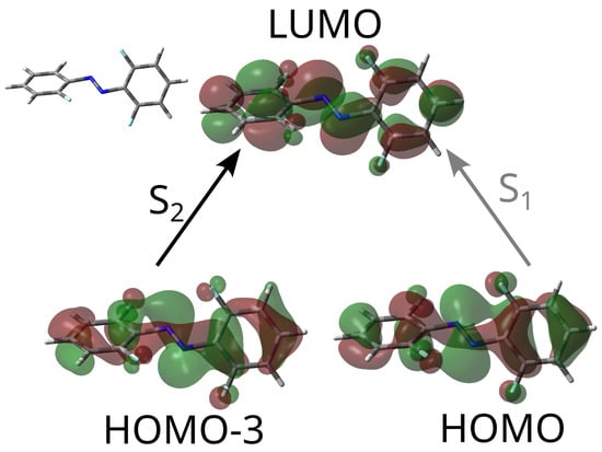 In both states, the orbital where excitation starts has local character over each of the phenyl moieties, but in the region on top of the azo group, the character of the MO is actually a mix. It has traits of character (because if is partly antisymmetric with respect to the double-bond plane, in the sense that the wave function has different signs on both sides of this plane), but the shape of each lobe is different. This “unclear” character with respect to the local double bond plane is a consequence of the fact that the molecule belongs to the symmetry point group, and no real symmetry plane containing the full molecule exists. Both excitations, then, break the double bond on the azo group, but they cannot be described either as or . What the calculations reveal is that is accessed with less probability than using electromagnetic radiation as a result of the precise value of the transition dipole moment.