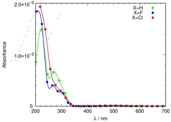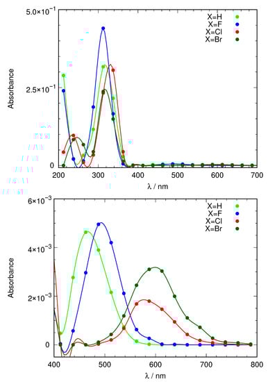 The lowest-lying excited states appear in two spectral regions, 2.6–2.8 eV and 3.9–4.5 eV, depending on the substituent X and the presence or not of the solvent. appears to be relatively insensitive to both factors, but shows a noticeable hypsochromic effect when halogens are present in the structure. For , the effect of the solvent is apparently larger and tends to reduce the excitation energy, indicating that has an increased dipole moment with respect to the ground state.