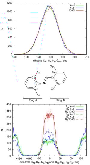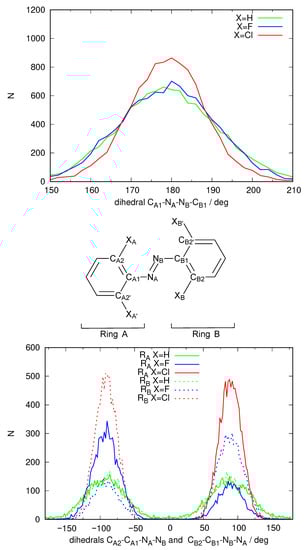 The spectrum shown in Figure 3 is not completely satisfactory: The band describing access to is located roughly between 400 nm and 500 nm and quite weak, as expected, but the main feature, the excitation to which ought to be present around 300 nm is unstructured, almost missing, hidden under the towering band peaking around 200–240 nm that corresponds to transitions to other excited states of energy higher than . An analysis of the structures that form the dynamical simulation reveals an anomaly in the geometries that each solute adopts during the simulation. Figure 4 shows a frequency plot detailing the values of the dihedral angle defining the configuration of the N=N double bond and the orientation of both phenyl rings with respect to the N=N bond. It can be seen that while the E configuration of the N=N double-bond remains stable over time, the orientation of the phenyl rings with respect to the N=N double bond is strange. Ror X=H, two peaks at are observed for each phenyl ring, meaning that both rings can rotate more or less freely around the respective C-N bond but on average adopt a perpendicular conformation with respect to the azo unit. When X=F rotation is more hindered, each ring is found mostly either at or . Finally, X=Cl rotation is so hindered that it does not happen during the 10 ns of the simulation. In any case, no structure is captured where these phenyl units are coplanar to the azo group (angles of 0 and ). In such an arrangement, the conjugation of the system cannot take place. The dihedral angle defining the configuration of the N=N double bond is 180 in the gas phase minimum energy structures found using DFT methodology, with only slight deviations for X=F, Cl (177). However, the dihedral angle describing the inclination of the phenyl rings with respect to the N=N double bond are quite different in this case (X=H 0, X=F 36, X=Cl 52). Hence, the simulation puts the phenyl rings completely perpendicular to the azo unit, making even a partial conjugation of the system impossible.
