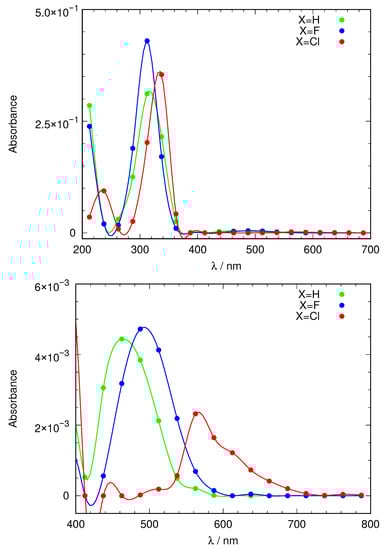 Figure 6 also shows an enlargement of the weak band, indicating transition to , which is actually the most interesting one as it is distinctly closer to the “optical transparency window” that would enable efficient use of the photoswitch in living tissue. These bands are substantially weaker than their counterparts. Interestingly, their maxima show a distinct bathochromic effect as X goes from H (460 nm) to F (490 nm) and finally to Cl (560 nm). Aside from the noticeable overall effect implying a shift of 100 nm, this is especially remarkable because the values derived from excitation energy calculations, both in the gas phase and DMSO (within CPCM theory), shown in Table 1 reduced this effect to only 11.5 nm and 11.6 nm, respectively, and without a clear trend.