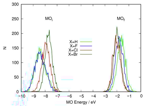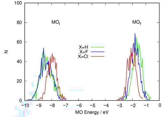 Conventionally, is described as a excited state and as a excited state. This agrees with the relative intensities of the transitions to both (weak and strong, respectively), as well as the expected ordering of the MOs; n (non-bonding) orbitals are described as derived from lone pairs of the atoms and accordingly higher in energy than bonding MOs. This fact suggests that excited states should lie lower in energy than ones. Even without considering the fluxionality introduced by the dynamics, these molecules do not have a symmetry plane (except for X=H), so the labels used are just approximate in the sense that they refer to the characteristics of the MOs in a local environment to the azo group, as can be seen in Figure 2. In this sense, the departing MO (the n part) is not an orbital composed solely from lone pairs. It has substantial contributions on the phenyl groups that are locally to these rings as well as sizeable contributions on the nitrogen and X atoms. Consequently, its energy must be affected when the nature of X changes. CAM-UB3LYP calculations of the atoms F and Cl reveal that the sHOMO for the former is −15.2 eV and −11.5 eV for the latter. Hence, if the lone pairs of X have an effect on the energy of the HOMO of the azobenzene derivative because they take part in the LCAO describing it, the observed trend would agree with the highest energy electrons of chlorine being higher than those of fluorine. In a rough sense, this agrees with the fact that both atoms belong to different periods. Chlorine involves the 3p shell while fluorine only the 2p one, lower in energy.